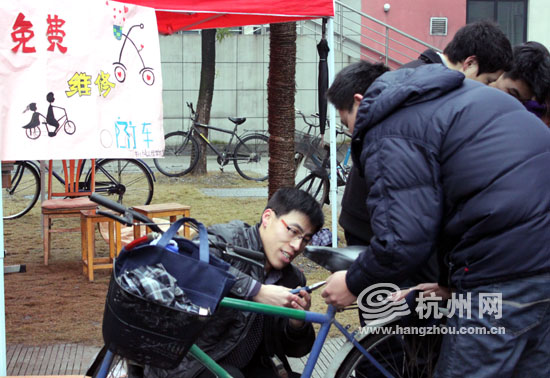 为了练手艺,创新学会的同学们就对自己的自行车“下黑手”,把车子拆了重装,熟悉每个零部件的结构和功能,刚开始,总有些车子在重新组装回来的时候是缺胳膊少腿的。但时间久了,在温永清的指导下十多个大学生都有了不错的修车技术,他们把服务的对象扩大到了整个杭电宿舍区。