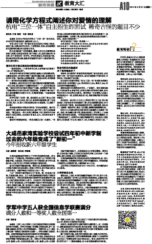 杭州市人才服务局毕业生就业处处长陆敏昨天也参加了面试。他说,考生表现大多不错,临场应变能力、学习能力、口头表达能力都令他刮目相看。“可惜我发现很多同学的兴趣爱好,为了高考都放弃了。有些学生申请材料随便写写,比如说自己喜欢看书,但问他看了什么书,却说不上来,只能说几本玄幻小说。”都市快报3月31日http://hzdaily.hangzhou.com.cn/dskb/html/2014-03/31/content_1701074.htm